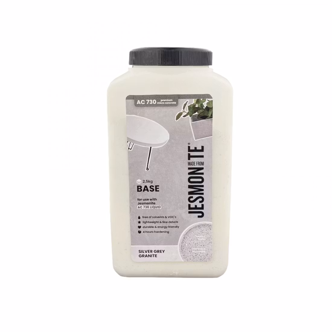 Jesmonite AC730 Silver/Grå granit är en snabbhärdande akrylmodifierad cementbaserad komposit. Systemet är främst utformat för glasfiberarmerade, lätta, handlaminerade dekorativa applikationer, men det kan även användas för små dekorativa gjutgods.